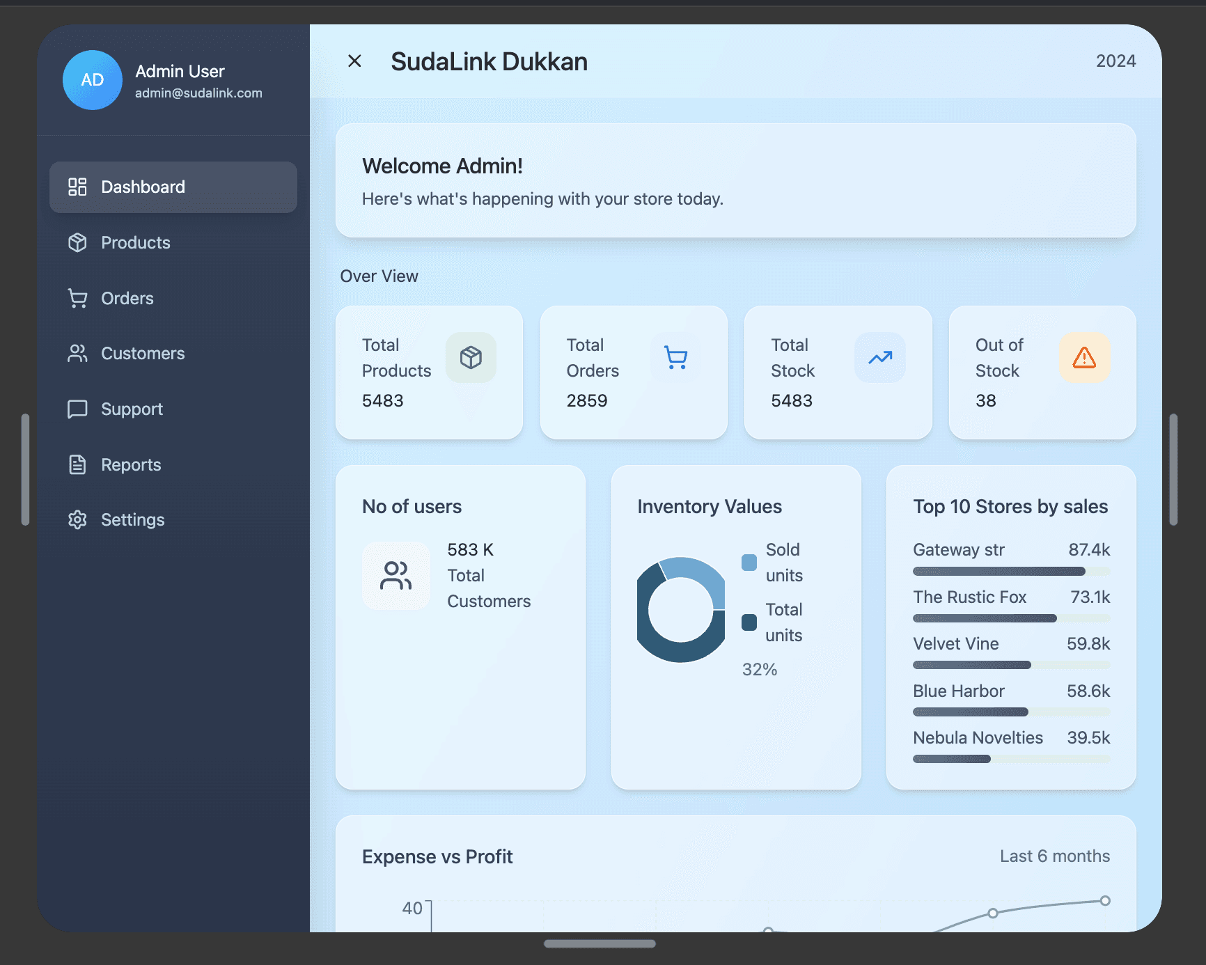تم تطوير لوحة تحكم مركزية لإدارة جميع الأنظمة والتطبيقات، تتيح التحكم الكامل في المحتوى، المستخدمين، الطلبات، والإحصائيات من واجهة واحدة واضحة وسهلة الاستخدام